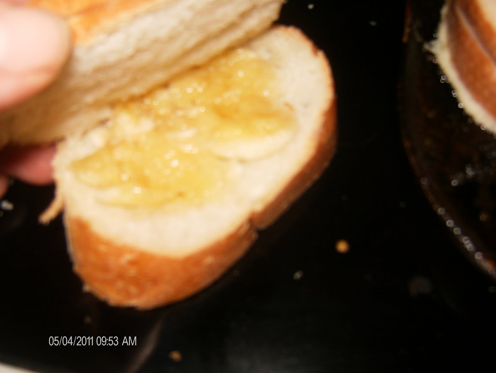 I had a loaf of french bread so I cut it into about 1 inch slices. I then cut 3/4 of the way down the middle of each slice and smeared on some smashed bananas between the two sides.